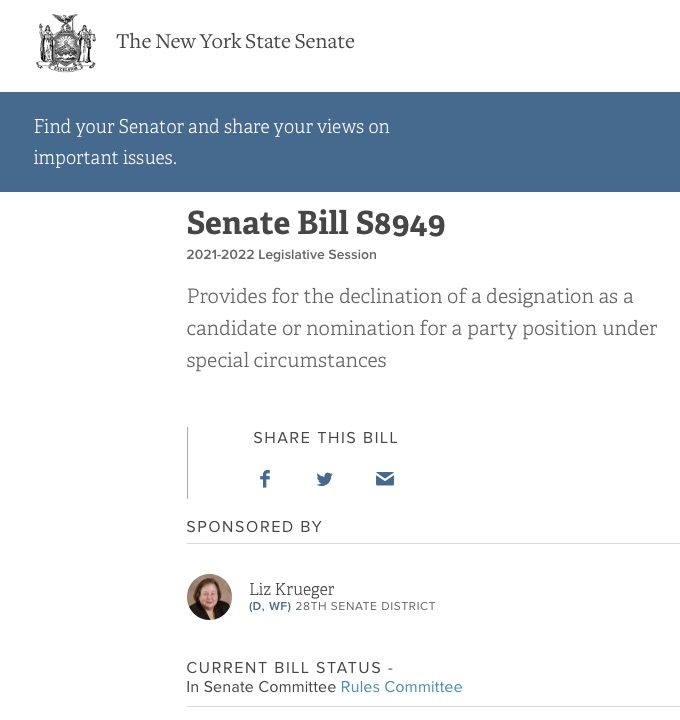 State Senate introduced bill S8949 on April 29 that would allow a candidate on the ballot be removed who has either been arrested OR charged OR convicted. The American jurisprudence of “innocent until proven guilty” has been watered down.