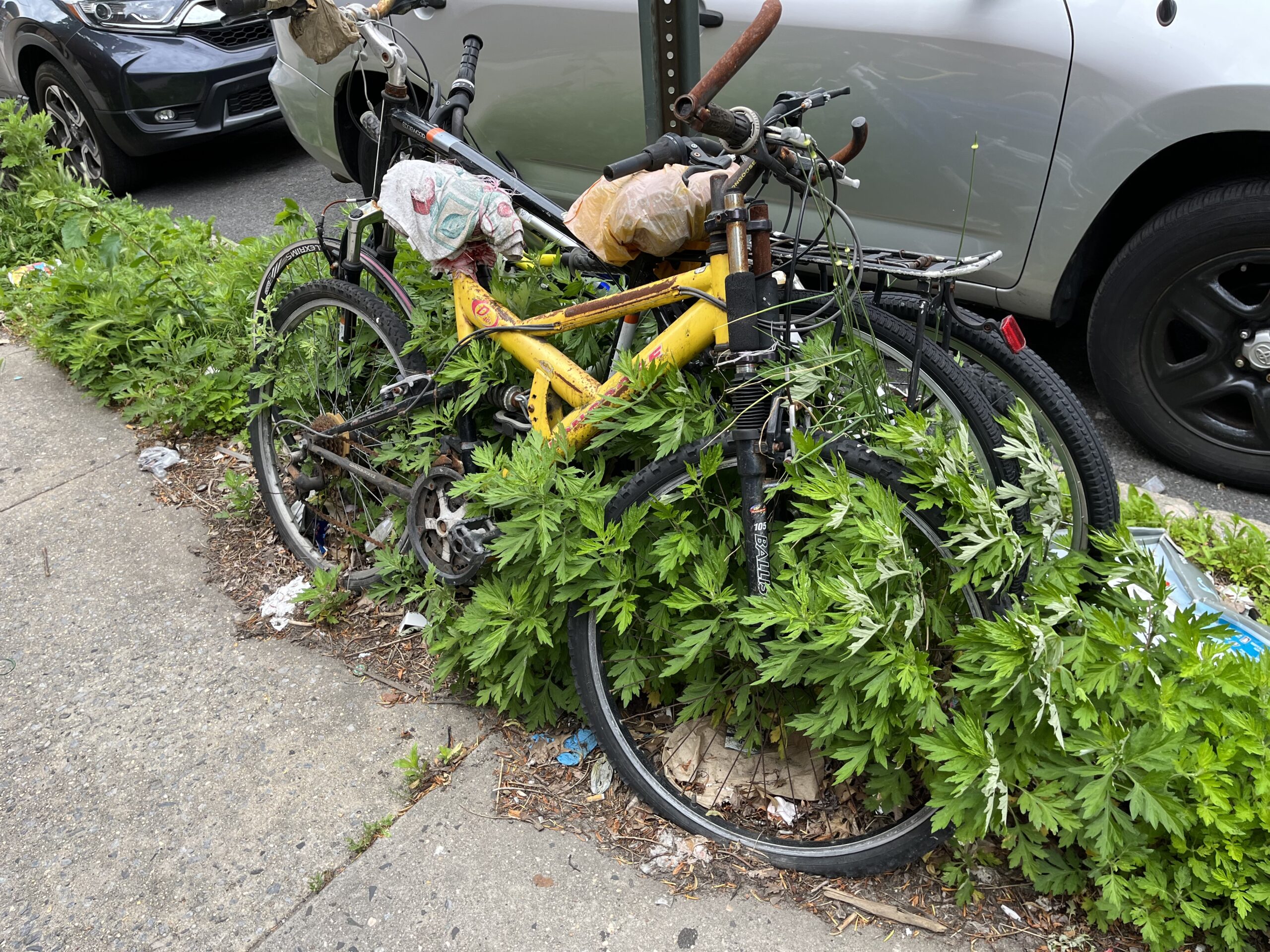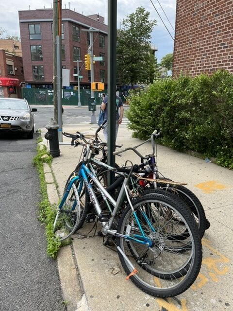 Update June 8, 2022. NYC311: 311-10581009 sent to DSNY. Next update within 14 days. Reported “(t)he Department of Sanitation investigated this complaint and found no condition at the location,” but bikes were removed at 6/8/2022 8:41 AM.