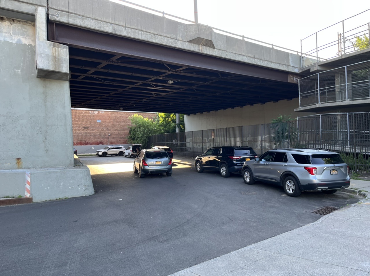 (1) Lighting is dark thus dangerous at night; (2) metal gate is broken in two places to the right and left of the stairway; (3) the no thru Woodhaven Boulevard Service Road cannot accommodate tractor trailers making turns. 18 wheelers entering are guaranteed to damage parked cars.