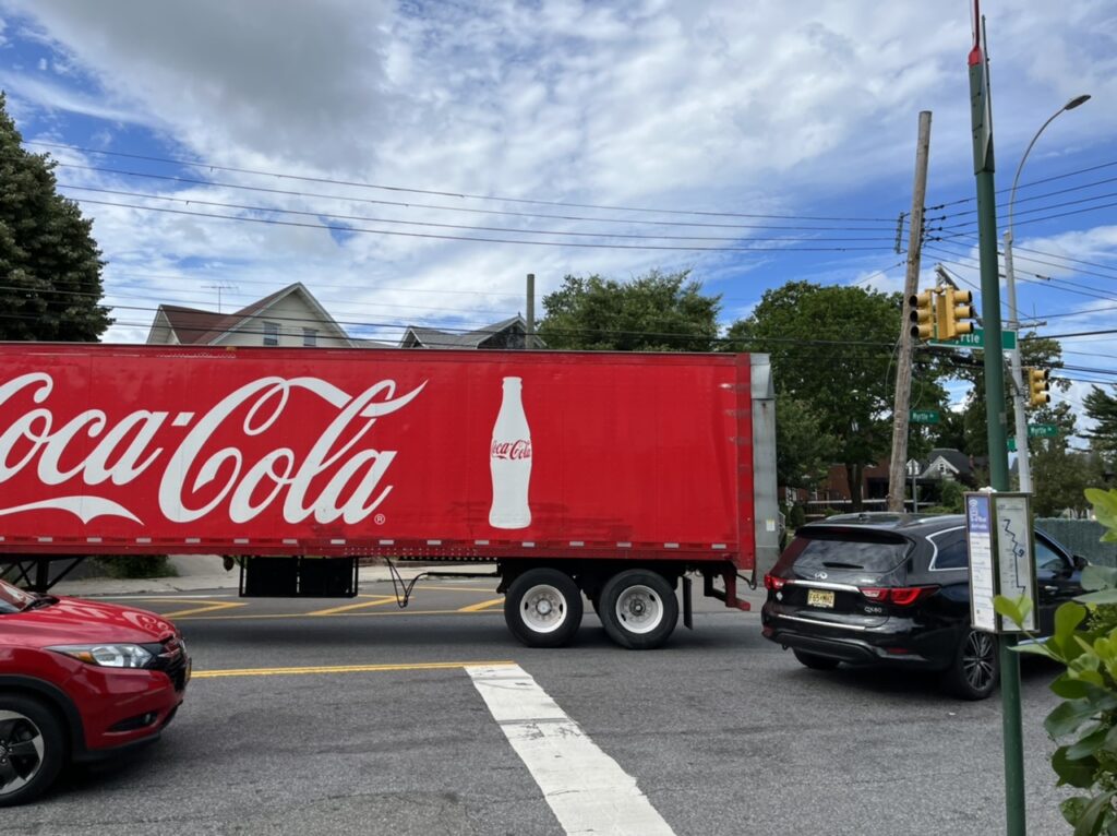 Coca-Cola truck turning west from 111 Street onto Myrtle. Perhaps a speed camera could be installed at 111 Street to capture these illegal maneuvers?
