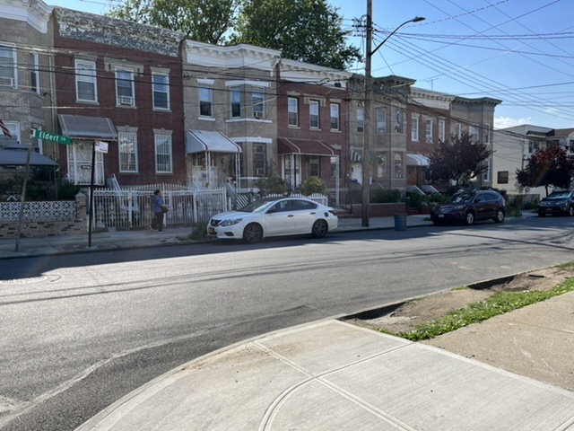 95 Avenue is one way westward, and dead ends at Eldert Lane. Because Eldert Lane is narrow with cars parked on both sides of the road (often on the sidewalk as evidenced by the worn out grass at this corner), cars turning left or right could have its line of sight blocked.