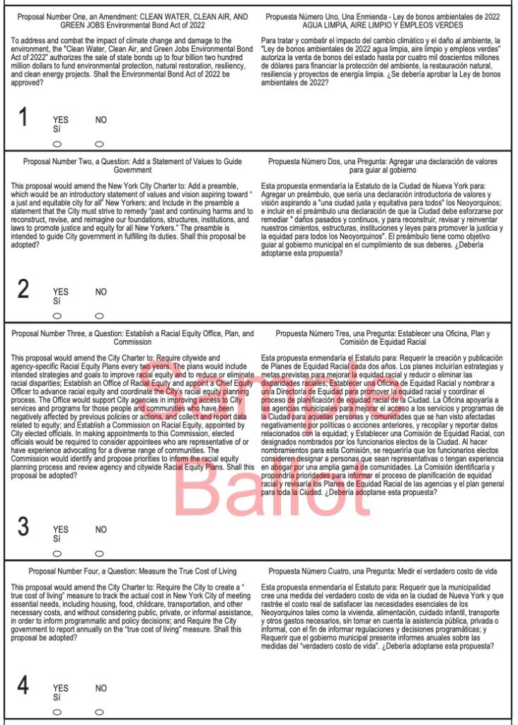 As for the four propositions, I will vote “NO” against the three (2, 3, 4) proposed by ex-Mayor de Blasio’s Racial Justice Commission.