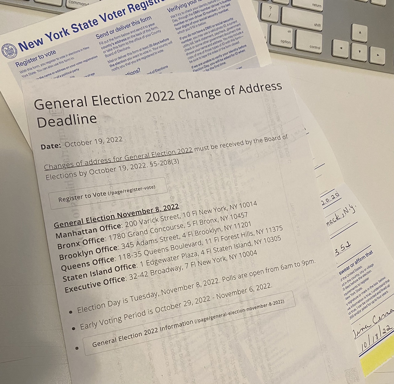 A voter registered in Suffolk County wants to vote in 15th State Senate district. Her form must be received by the Board of Elections before 5 pm today.