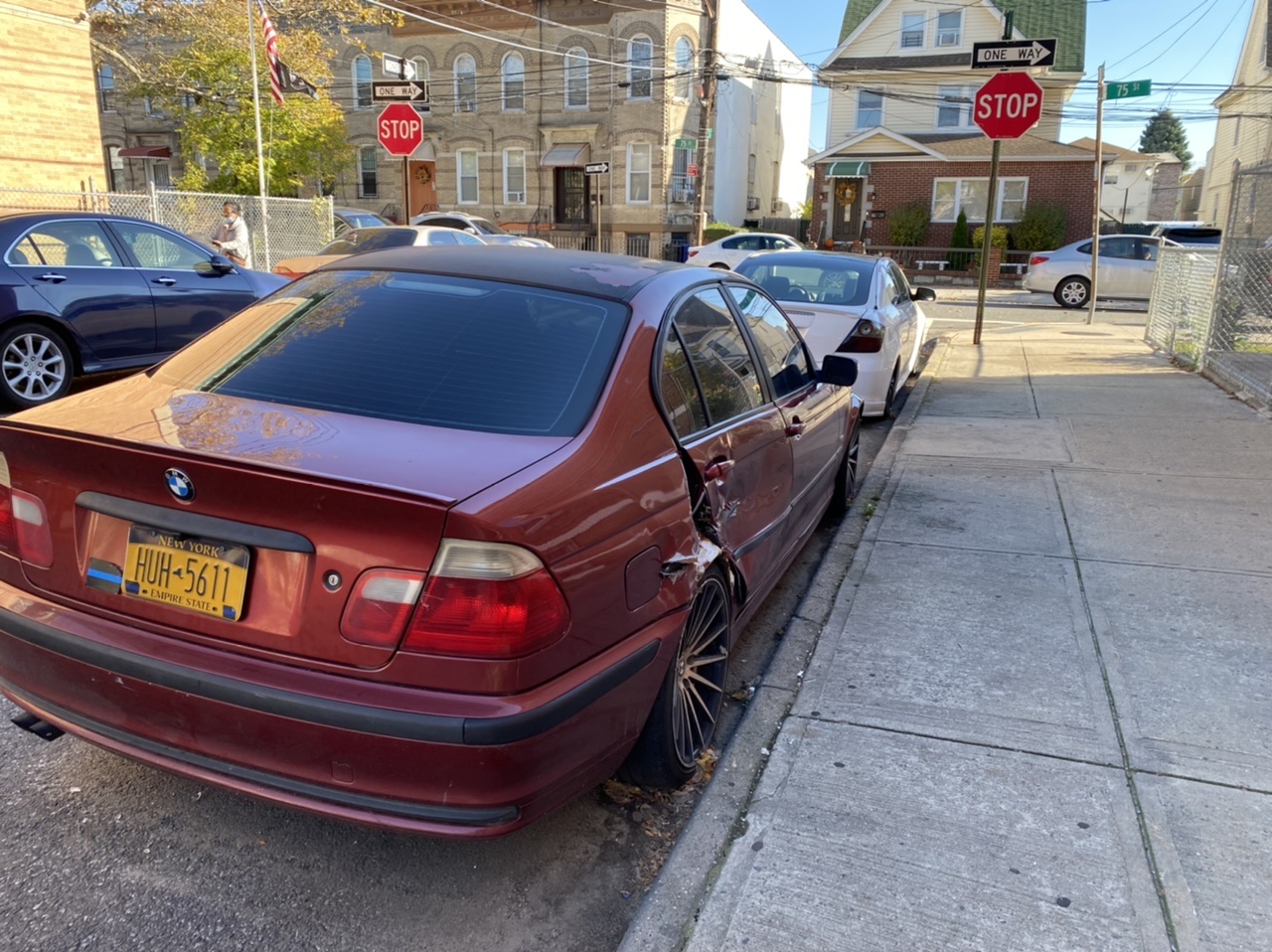 Commercial vehicles park overnight; Many cars have not moved for over a year including this red BMW; Eldert Avenue homeless shelter residents open trash bags…