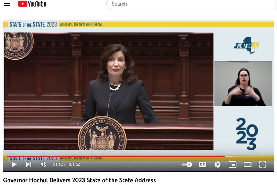 Governor Kathy Hochul included it in her State of the State Address “switching from fossil fuels to clean electric heating systems” (50:50) “a promise that (owners of homes electrified) will never spend more than 6% of their income on electricity” (51:10) on Tuesday, January 10, 2023.
