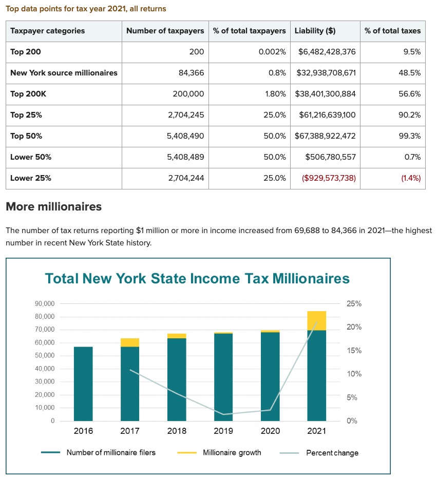 New York State Personal Income Tax Facts: 10.8 million returns filed. Top 200 filers paid 9.5% of total taxes. Those reported $1,077,500 of income (millionaires with a tax rate of 8.82%) or more paid $33 billion in income tax. While the lowest quartile is subsidized $930 million.