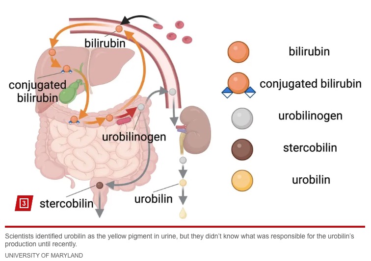 “Urobilinogen then spontaneously degrades into a molecule called urobilin, which is responsible for the yellow color we are all familiar with.”